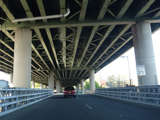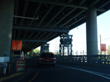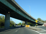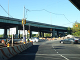 The Unionport Bridge carries Bruckner Boulevard across Westchester Creek. On the other side of the bridge, there is a traffic light at Brush Avenue.