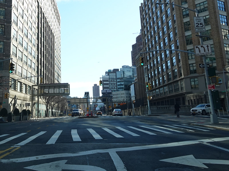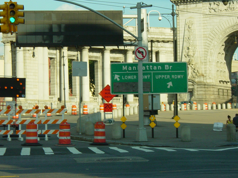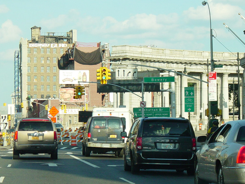 All motorists who do not turn off at the Bowery are forced onto the Manhattan Bridge. Bear left for the lower roadway or right for the upper roadway.