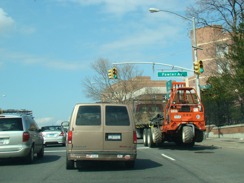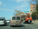 College Point Boulevard begins at the interchange of the Long Island Expressway (I-495) and the Van Wyck Expressway (I-678) in Queens and runs north as a four-lane divided road. There is an oversized street name sign at 57 Road.