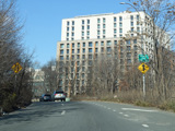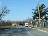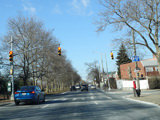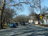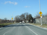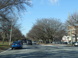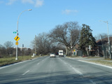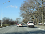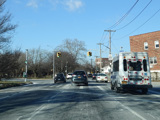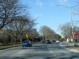 After NY 27 splits off from North Conduit Avenue it continues northwest as a three-lane one-way street. South Conduit Avenue is on the other side of the large grass median in this area.