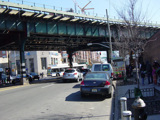 Coney Island Avenue passes under elevated subway tracks. Immediately after the tracks, there is a traffic light with an oversized street name sign at Brighton Beach Avenue.