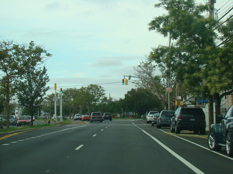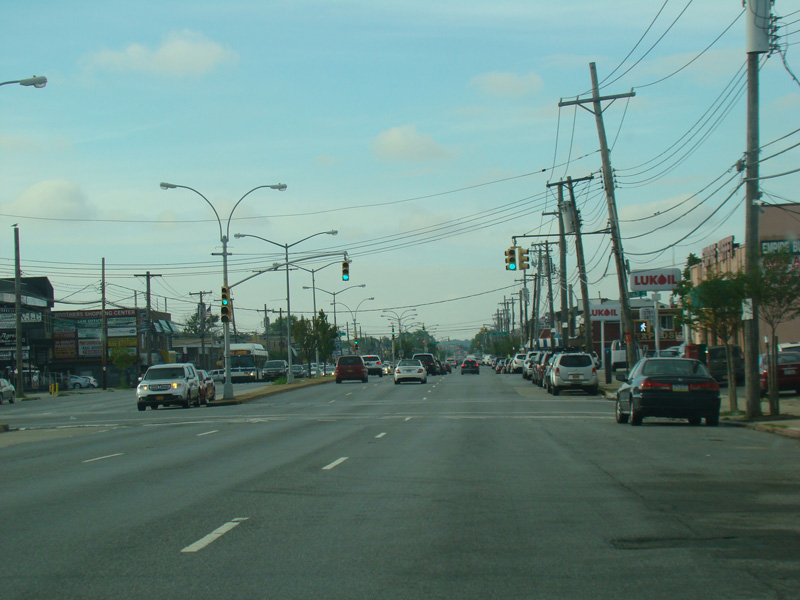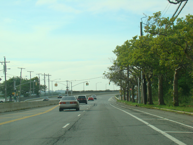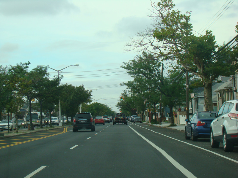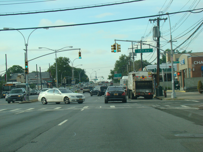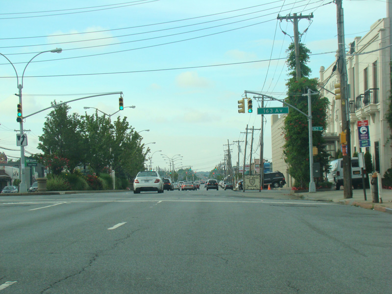 In Howard Beach, Cross Bay Boulevard widens to six lanes. The cross streets here are numbered avenues, beginning with 165 Avenue and descending until 156 Avenue. There are traffic lights at all the avenues, and all of them have oversized street name signs except for 162 Avenue.