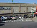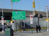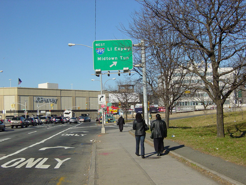 Just before the northern terminus, there is an entrance to the Long Island Expressway (I-495) west. Woodhaven Boulevard ends at Queens Boulevard (NY 25). An overpass carries Woodhaven Boulevard over the main road of Queens Boulevard, so it only intersects the service roads. Turn right at the first traffic light to go east on Queens Boulevard and for an entrance to the expressway east. Turn left at the second traffic light to go west on Queens Boulevard. The Queens Center Mall is straight ahead.