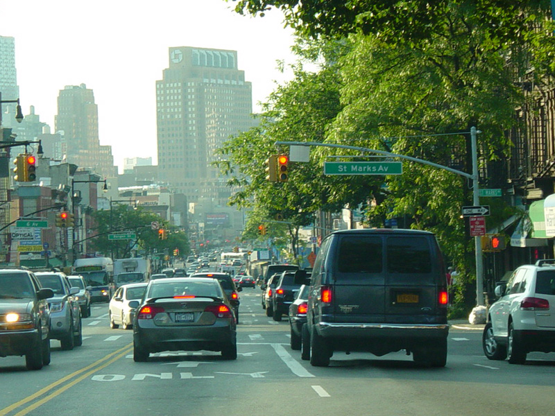 Flatbush Avenue runs north through Brooklyn as a six-lane road. There are oversized street names at 8 Avenue, Sterling Place, Park Place, 7 Avenue, Saint Marks Avenue, 6 Avenue, Bergen Street, Dean Street, 5 Avenue, Atlantic Avenue, 4 Avenue, Livingston Street, Willoughby Street, and Myrtle Avenue.