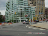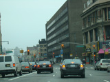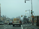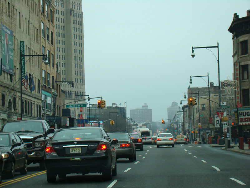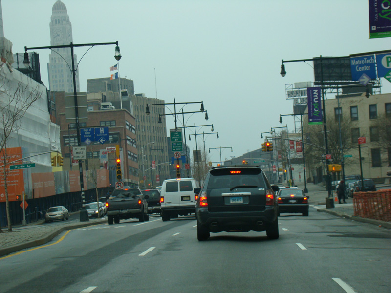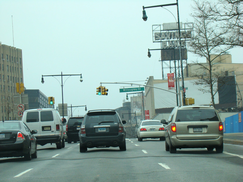 Flatbush Avenue begins at the Manhattan Bridge and runs south through Brooklyn as a six-lane road. There are oversized street name signs at Myrtle Avenue, Willoughby Street, and Livingston Street.