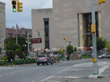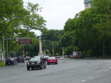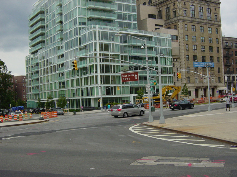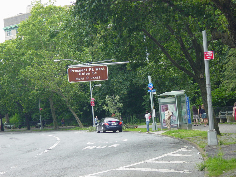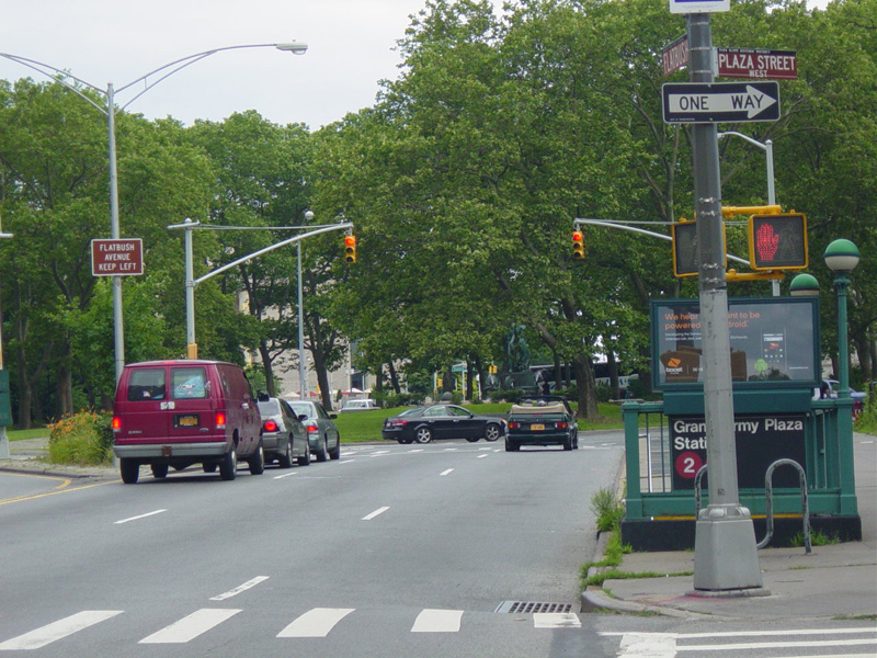 Skipping a short distance to the south, there is a traffic circle at Grand Army Plaza. There is an exit on the right for Union Street and Prospect Park West. At the southern end of the circle, bear right to continue south on Flatbush Avenue. Bear left for Eastern Parkway.