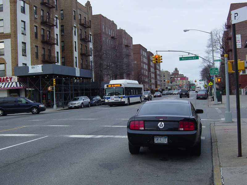 4 Avenue begins at the Belt Parkway and Shore Road and runs north as a four-lane undivided road through the Bay Ridge area of Brooklyn. There are traffic lights with oversized street name signs at 100 Street, 99 Street, Marine Avenue, 97 Street, 96 Street, and 95 Street.