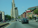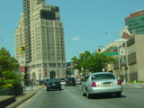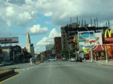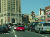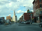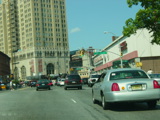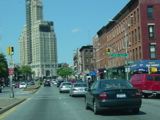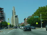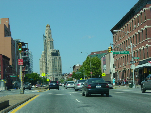 Skipping a few miles to the north, 4 Avenue runs north through Brooklyn as a four-lane divided road. There are oversized street name signs at 1 Street, Garfield Place, Carroll Street, President Street, Union Street, Sackett Street, Degraw Street, Douglass Street, Butler Street, Baltic Street, Warren Street, Saint Marks Place, Bergen Street, Dean Street, and Pacific Street. The Williamsburg Savings Bank is visible in the distance.