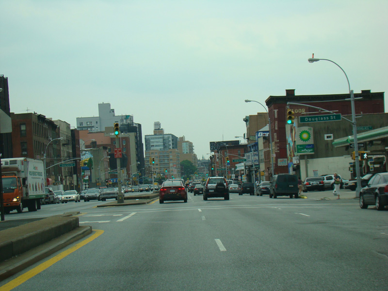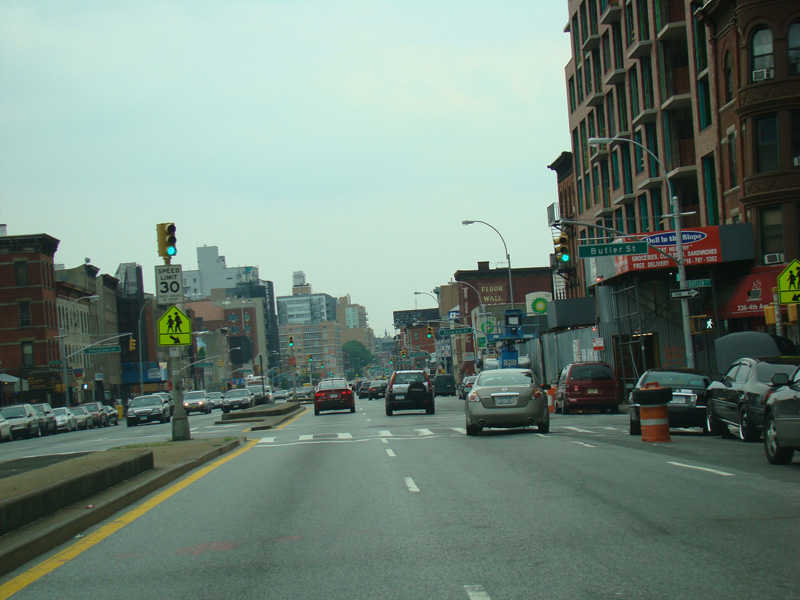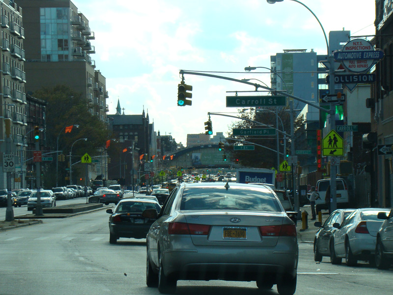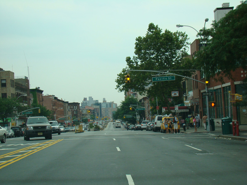4 Avenue runs south through Brooklyn as a four-lane divided road. There are oversized street name signs at Pacific Street, Dean Street, Bergen Street, Saint Marks Place, Warren Street, Baltic Street, Butler Street, Douglass Street, Degraw Street, Sackett Street, Union Street, President Street, Carroll Street, and Garfield Place.