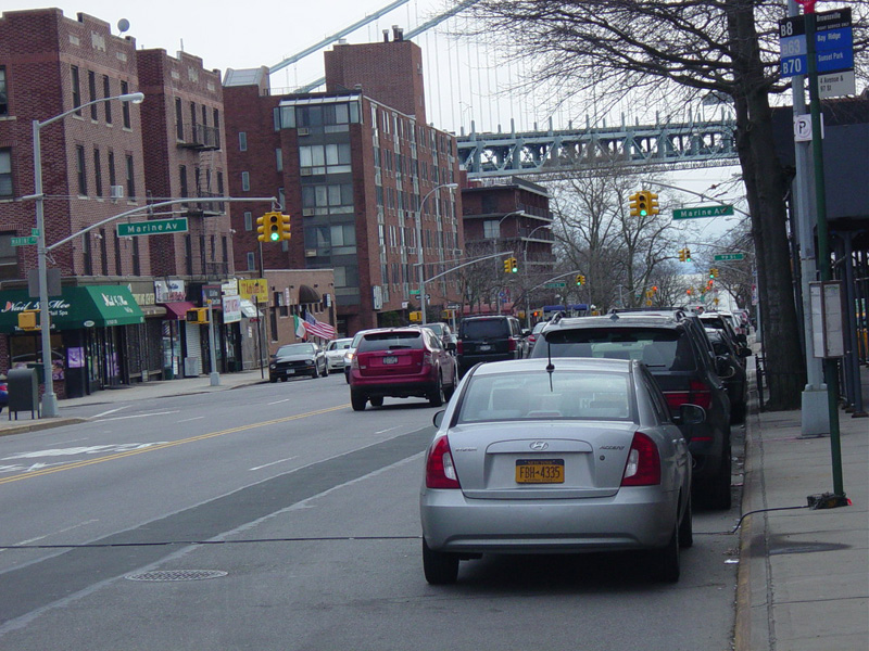 Skipping south to Bay Ridge, 4 Avenue runs south as a four-lane undivided road. There are traffic lights with oversized street name signs at 96 Street, 97 Street, Marine Avenue, 99 Street, and 100 Street.