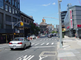 Fulton Street ends here at Flatbush Avenue. Turn right to go north or left to go south. The Fulton Mall, an extension of Fulton Street that is only open to buses and pedestrians, is straight ahead.
