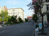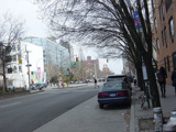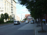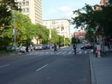 At 6 Avenue, Houston Street becomes a two-way street. It widens to become a four-lane divided road and runs east through Greenwich Village. There is an oversized street name sign at West Broadway.