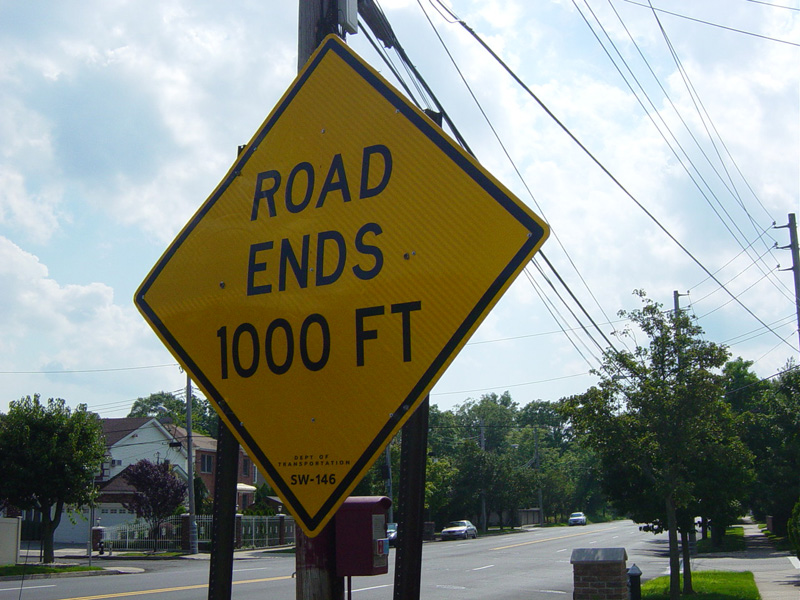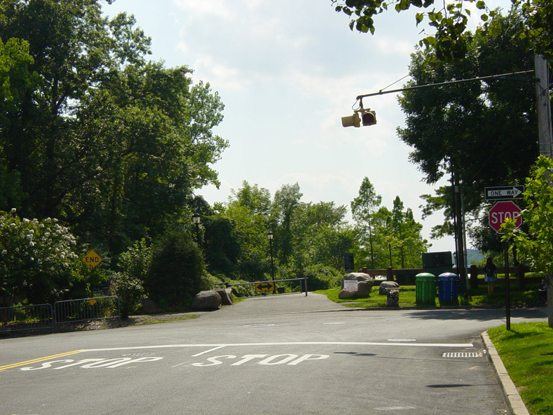 Hylan Boulevard ends here at a flasher. The parking lot for Conference House Park is to the left. Satterlee Street is to the right.