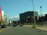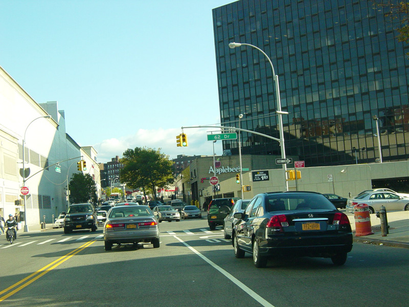 Junction Boulevard runs south through Rego Park as a two-lane undivided road. The Rego Center shopping mall is on the left. There is a traffic light with an oversized street name sign at 62 Drive. Straight ahead, Junction Boulevard is a one-way street in the other direction for its last block. Turn right onto 62 Drive for access to Queens Boulevard (NY 25).
