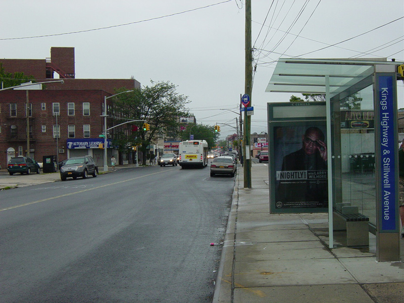in Brooklyn and runs east as a two-lane undivided road. There is a traffic light at Stillwell Avenue.