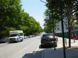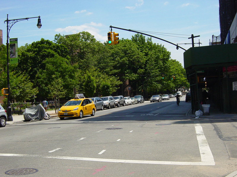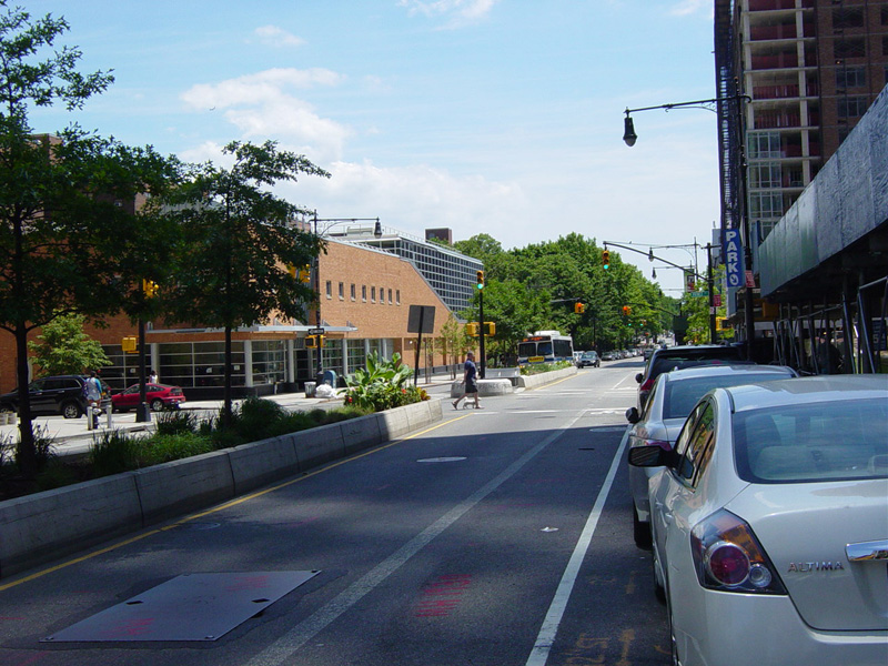 Myrtle Avenue becomes a major roadway at Flatbush Avenue in Brooklyn. It is divided for the first couple of blocks, after which the divider ends. There is a traffic light with an oversized street name sign at Prince Street.