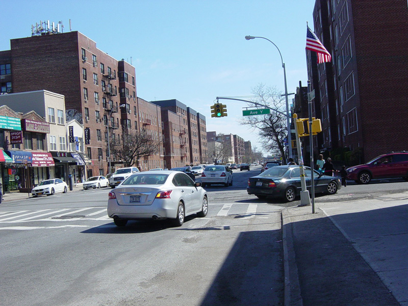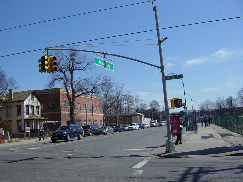 Ocean Avenue runs south through Brooklyn as a four-lane undivided road. There are traffic lights with oversized street name signs at Avenue Y, Avenue Z, and Voorhies Avenue.