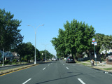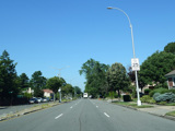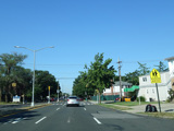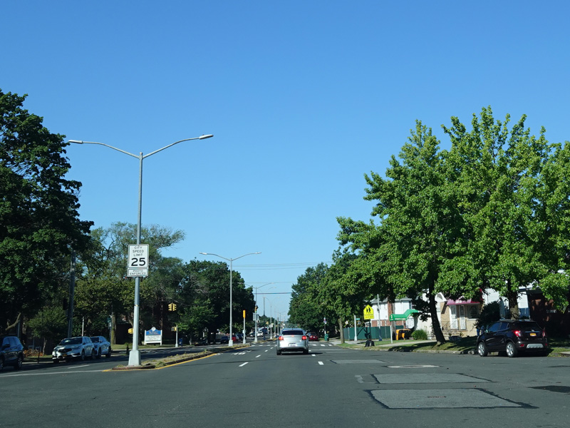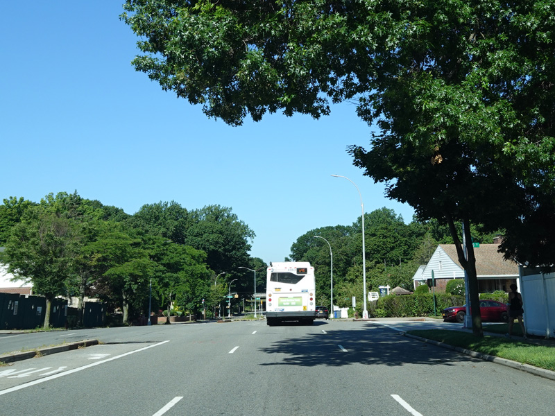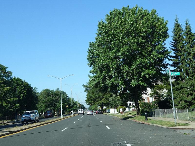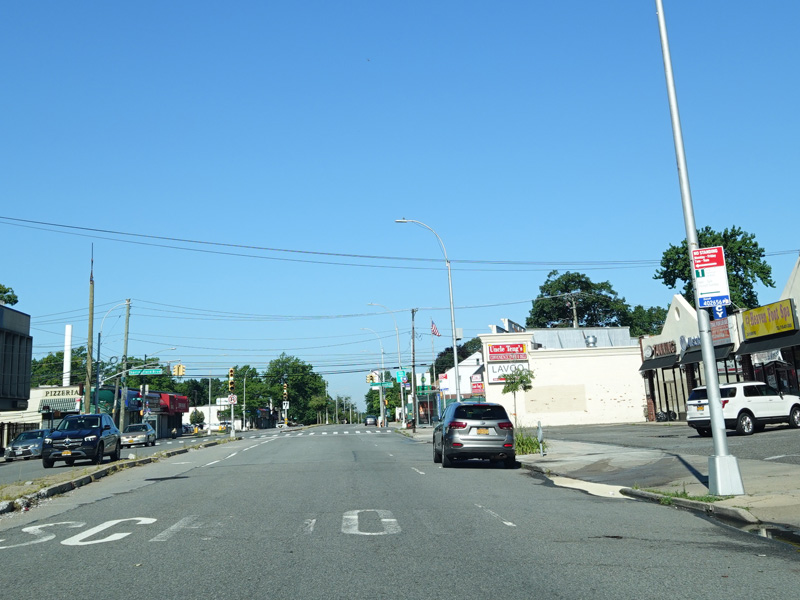 Welcome to Queens! Union Turnpike loses the NY 25C designation at the county line and runs west as a four-lane divided road. There is an oversized street name sign at Little Neck Parkway.