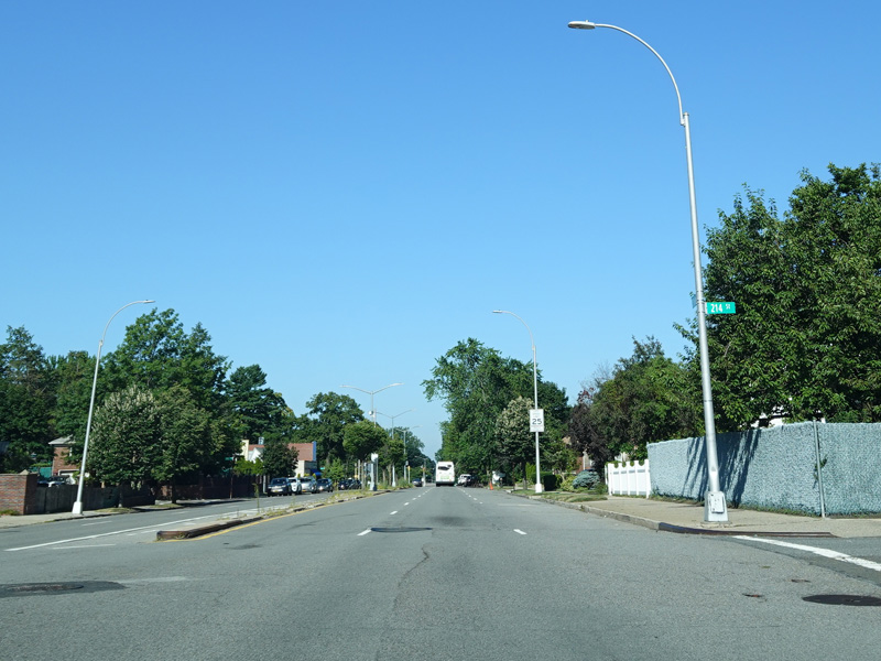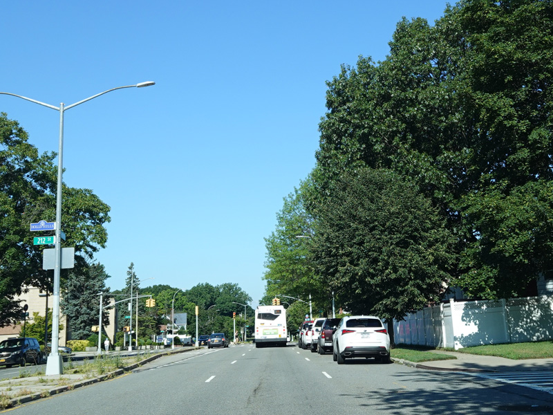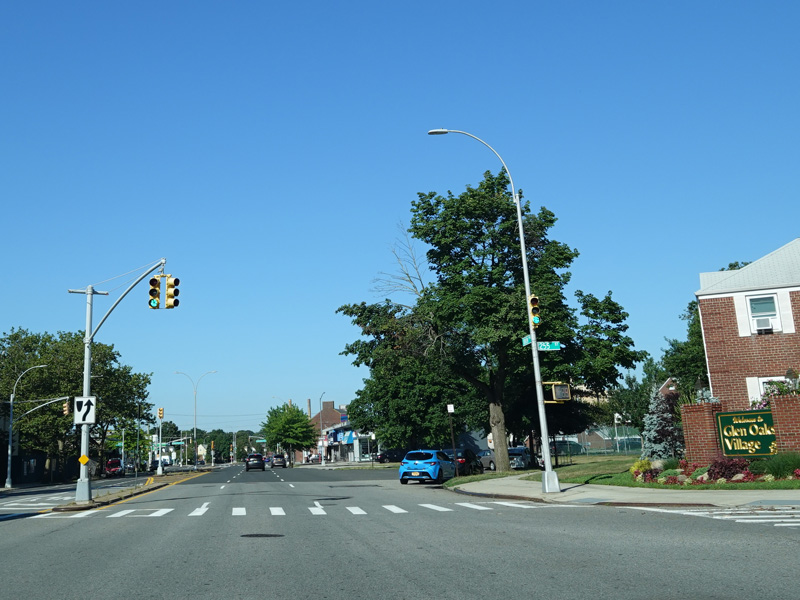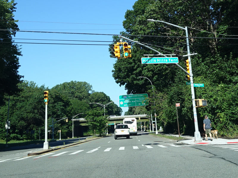 Union Turnpike continues west through Queens. There are oversized street name signs at Springfield Boulevard, Bell Boulevard, and Hollis Hills Terrace.