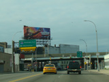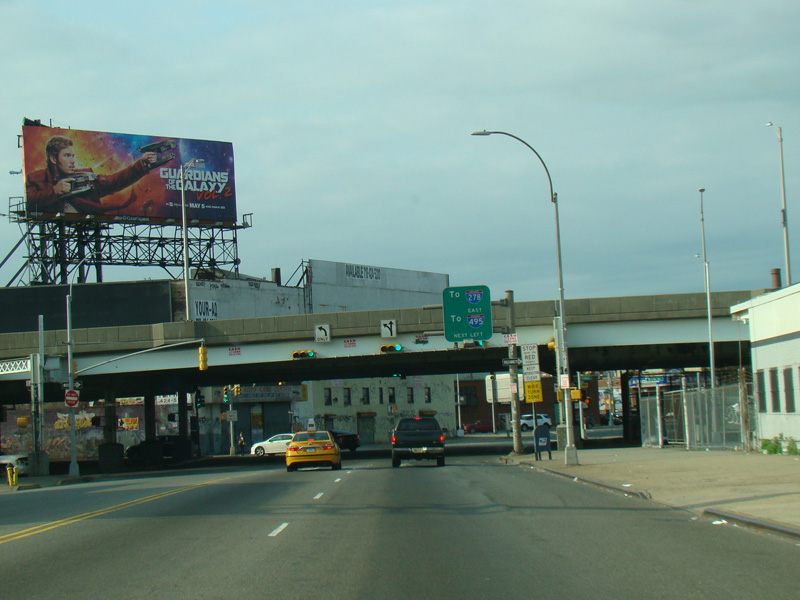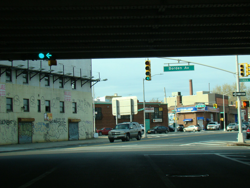 Van Dam Street passes under the Long Island Expressway (I-495). Immediately thereafter, there is a traffic light with an oversized street name sign at Borden Avenue. Turn left for access to the Brooklyn-Queens Expressway (I-278) and the Long Island Expressway (I-495) east.