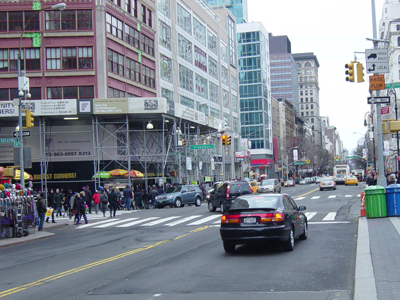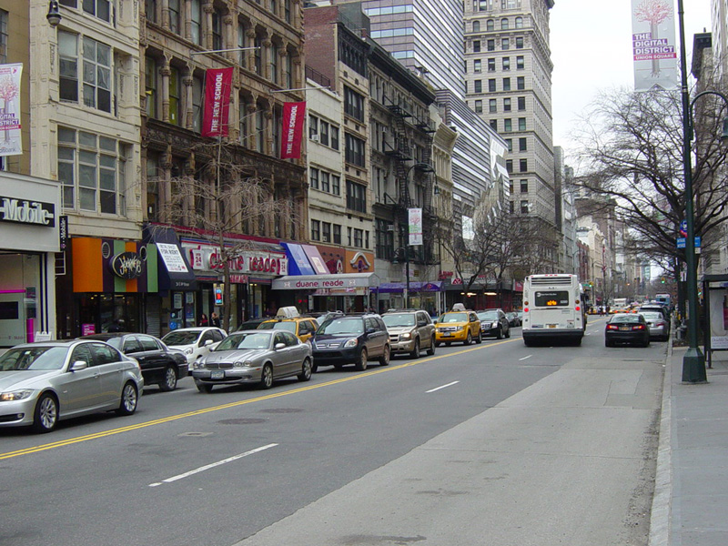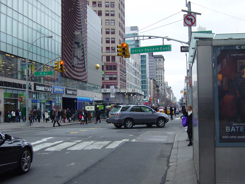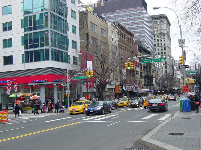 Union Square is to the right in this area. There are oversized street name signs at Union Square East, 4 Avenue, Broadway, Union Square West, and University Place.