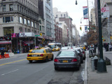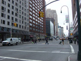 West 14 Street runs west as a four-lane undivided road. There are traffic lights with oversized street name signs at 6 Avenue, 7 Avenue, 8 Avenue, and 9 Avenue.