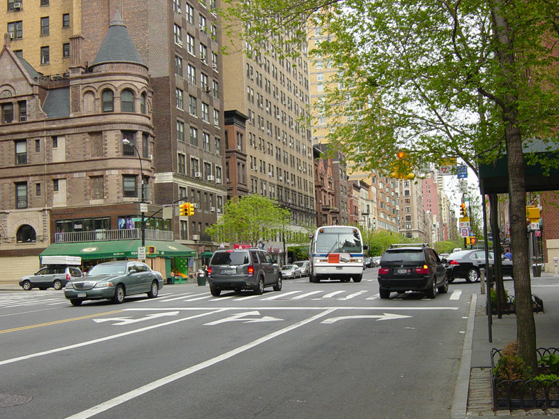 West 72 Street ends here at Central Park West. Continue straight ahead into Central Park for the West Drive. The transverse road connecting West 72 Street to East 72 Street is one-way in the other direction. Motorists wishing to cross the park to the East Side must travel south to West 65 Street or north to West 81 Street.