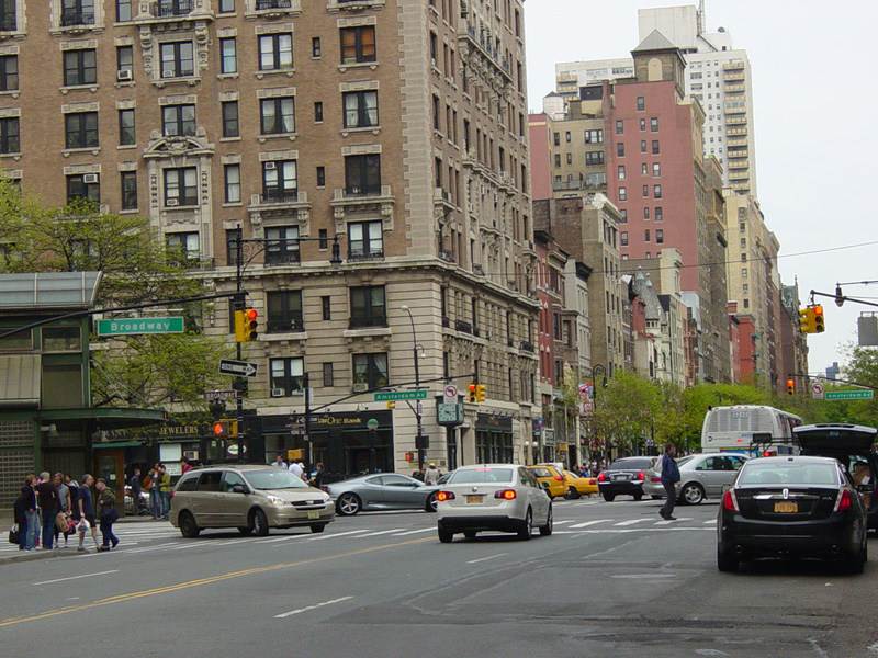 West 72 Street intersects Broadway and Amsterdam Avenue at a pair of traffic lights. There are oversized street name signs at both intersections. The two roads cross at West 72 Street. Northbound traffic on Broadway is forced onto Amsterdam Avenue. There is a major subway station on this block of West 72 Street.