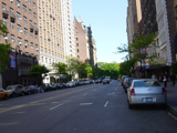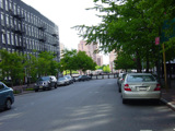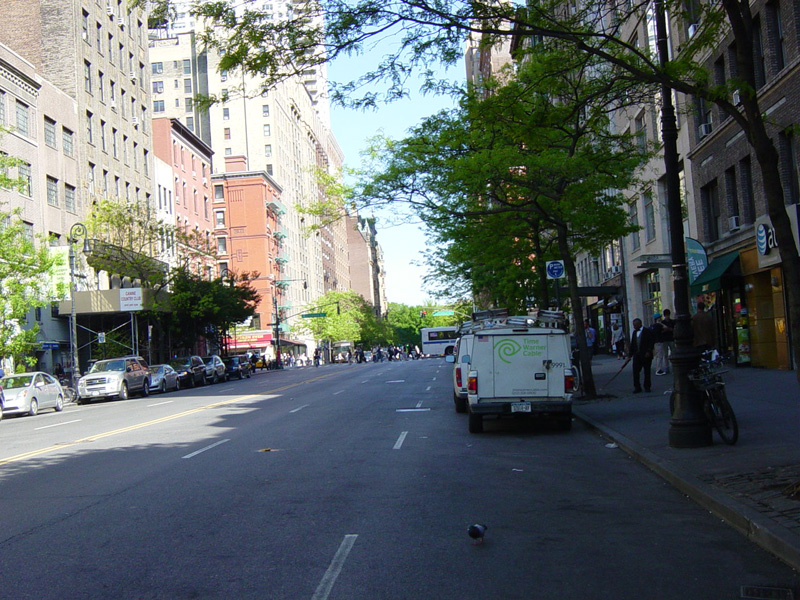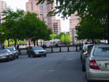 After York Avenue, East 72 Street narrows down to two lanes. There is still a double yellow line down the middle, but it is badly faded away and therefore difficult to see in the pictures. The eastern terminus of East 72 Street is a dead end near the East River. The buildings visible straight ahead are located on Roosevelt Island.