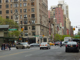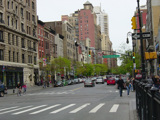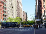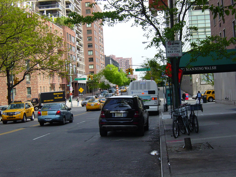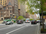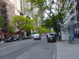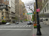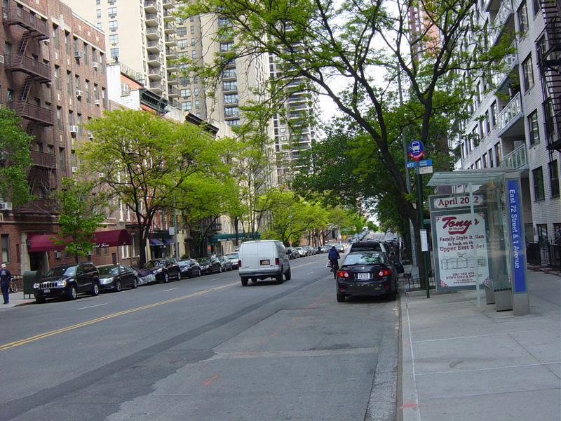 Skipping a substantial distance, East 72 Street runs east as a four-lane undivided road across the Upper East Side. There is a traffic light with an oversized street name sign at York Avenue.