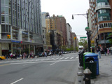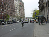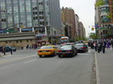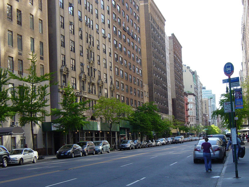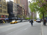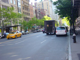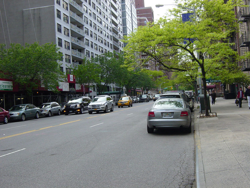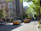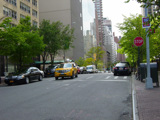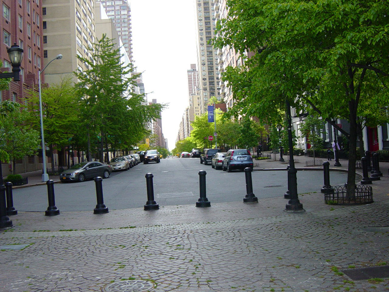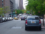 East 72 Street begins at a dead end near the East River. For the first block, it is a two-lane undivided road. There is a double yellow line down the middle, but it is badly faded away and therefore difficult to see in the pictures. There is a traffic light with an oversized street name sign at York Avenue.