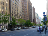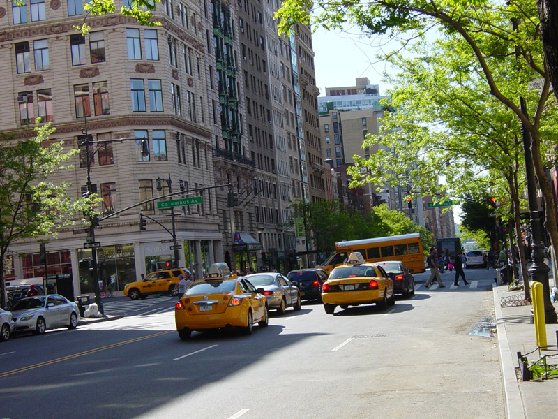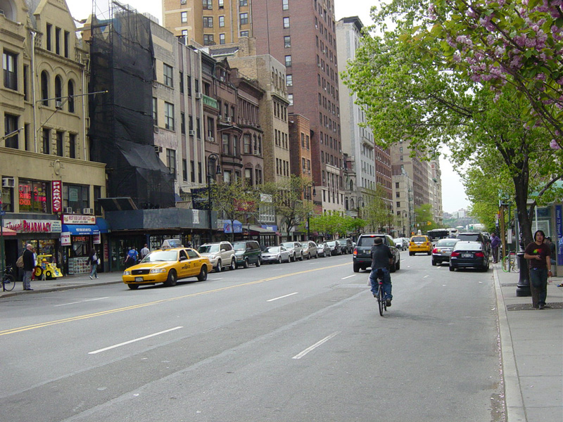 West 72 Street runs west across the Upper West Side as four-lane undivided road. There is an oversized street name sign at Columbus Avenue.
