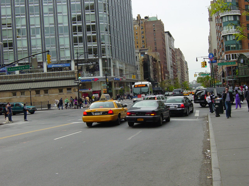 West 72 Street intersects Amsterdam Avenue and Broadway at a pair of traffic lights. There are oversized street name signs at both intersections. The two roads cross at West 72 Street. Northbound traffic on Broadway is forced onto Amsterdam Avenue. There is a major subway station on this block of West 72 Street.
