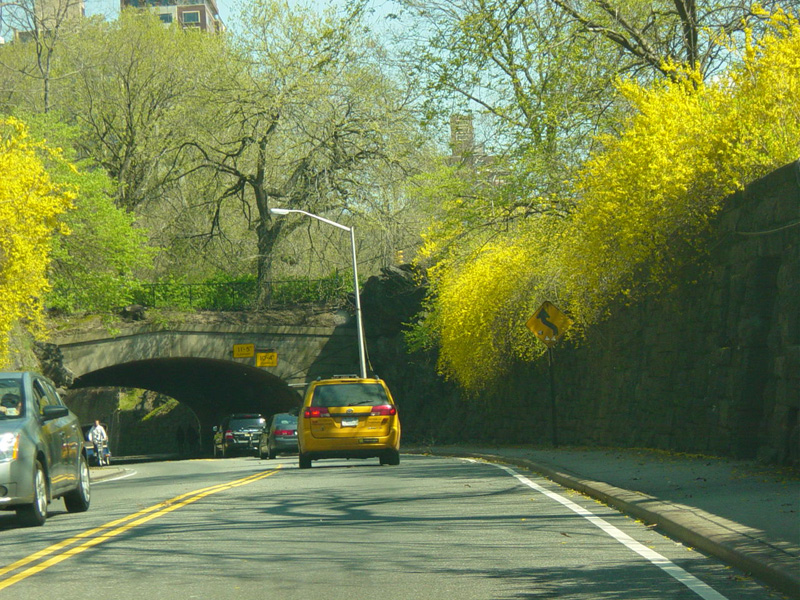 The transverse road is a super-2, a two-lane undivided limited-access highway, crossing Central Park. There are three overpasses, as well as a single traffic light in the middle of the park.