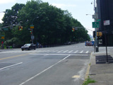 Since the westbound exit from the transverse road is aligned with West 97 Street, motorists must travel south one block along Central Park West to continue along West 96 Street. A small sign for the Henry Hudson Parkway (NY 9A) points to the right at West 96 Street.