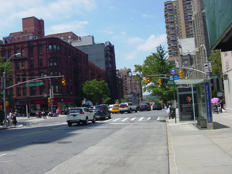 West 96 Street begins at Central Park West and runs west across the Upper West Side as a four-lane undivided road. There are oversized street name signs at Columbus Avenue and Amsterdam Avenue.