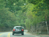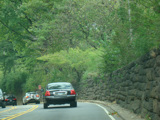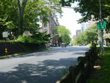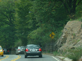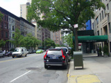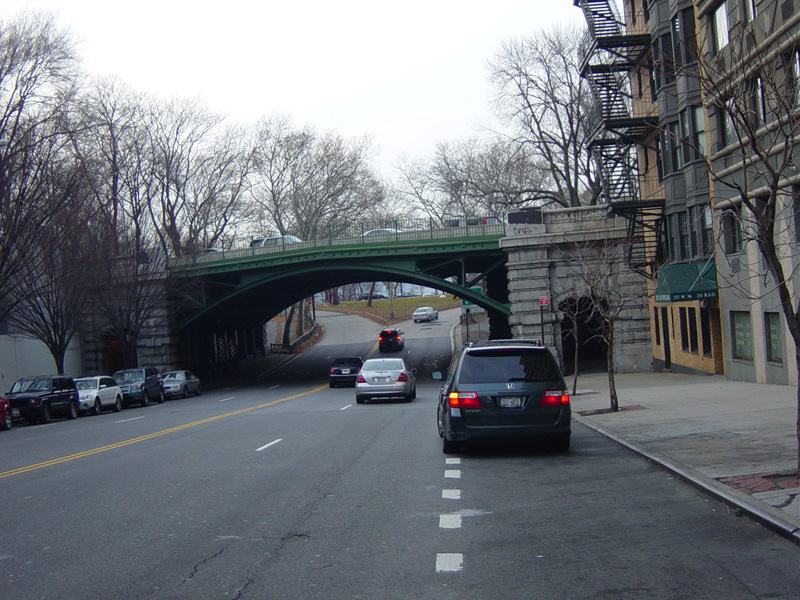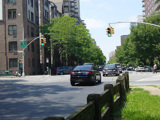 The transverse road ends here at Central Park West. When travelling in this direction, the exit from the transverse road is aligned with West 97 Street, which is straight ahead. To continue along West 96 Street, turn left onto Central Park West and then turn right at the first traffic light. Small signs direct motorists heading toward the Henry Hudson Parkway (NY 9A) to do just that.