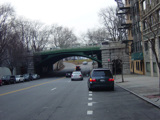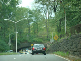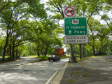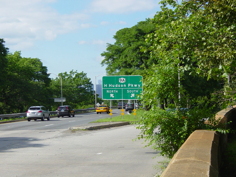 After the overpass, West 96 Street ends at the Henry Hudson Parkway (NY 9A). In a somewhat unusual interchange, the ramp that West 96 Street becomes passes next to the northbound lanes of the parkway. Motorists wishing to travel north can change lanes onto the parkway. Motorists wishing to go south can continue along the ramp, which then curves around and passes under the parkway before merging with the southbound lanes.