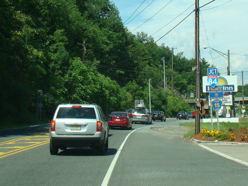 Welcome to New York and to Orange County! NJ 23 turns into CR 15 at the state line. The signage here, which is not particularly prominent, welcomes motorists only to Orange County, not to New York State. The one and only CR 15 route shield is located here at the state line.