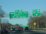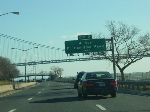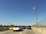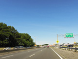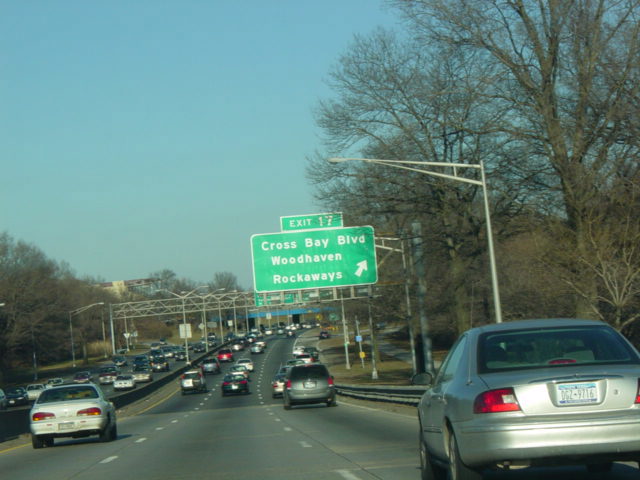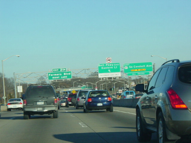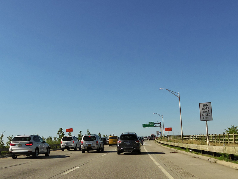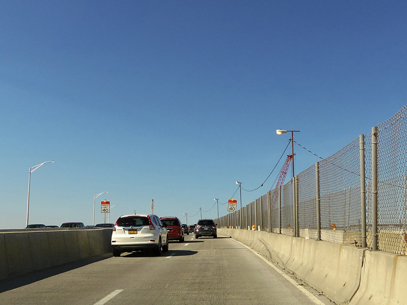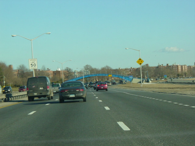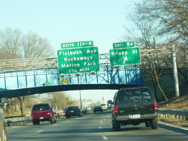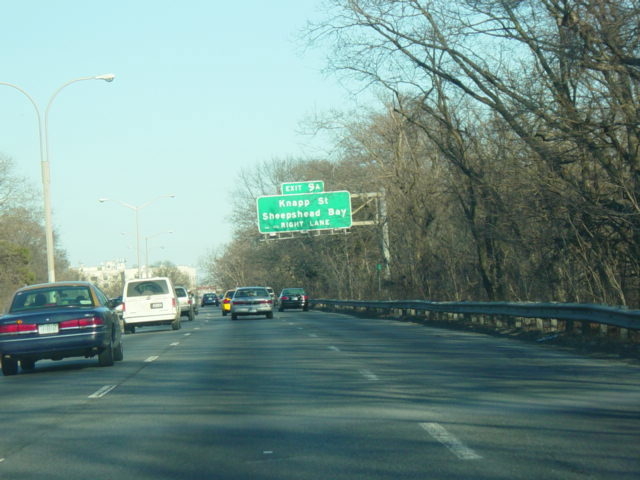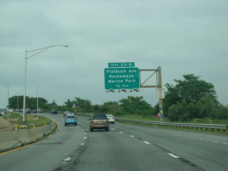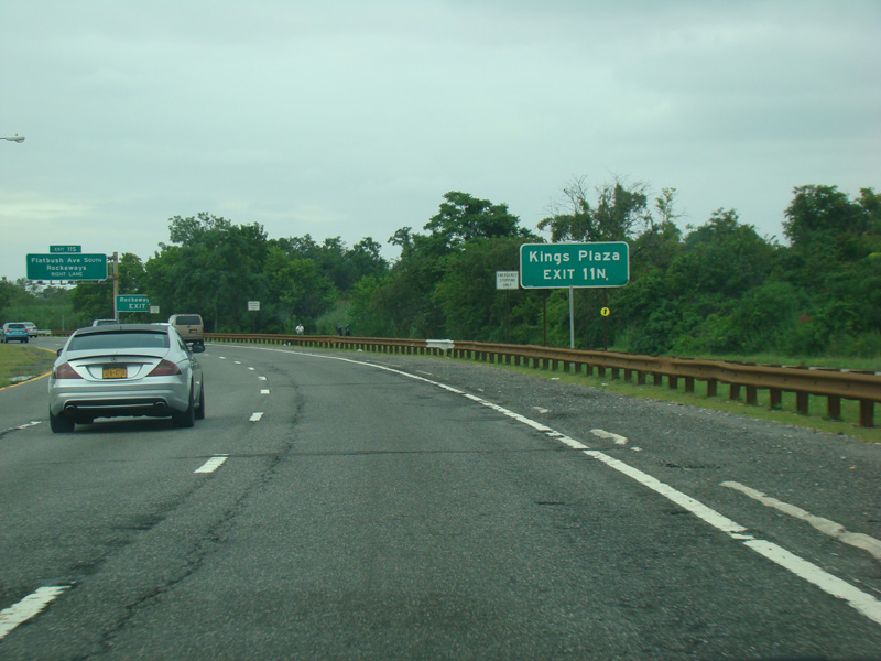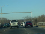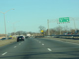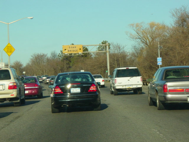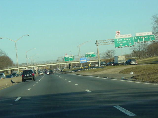 These pictures show the Belt Parkway eastbound at it appeared in 2006. Most of the signs and some of the overpasses have since been replaced. The two drawbridges have been replaced with non-movable bridges.