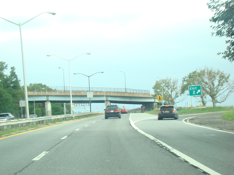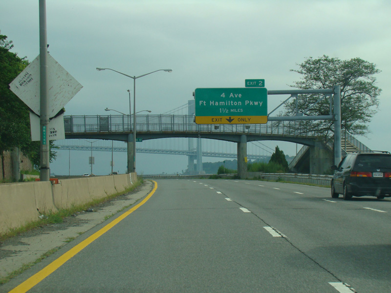 The Belt Parkway runs along the shore through Brooklyn. The Verrazano Bridge (I-278) is visible in the distance. Exit 2 is for 4 Avenue and Fort Hamilton Parkway. To access the Verrazano Bridge (I-278) from the westbound Belt Parkway, it is necessary to get off at exit 2 and go through the local streets.