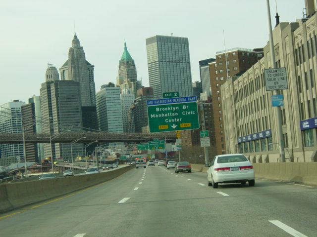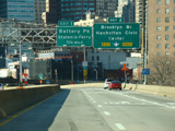 The left-hand sign on this sign bridge replaced a sign for the Hugh L. Carey Tunnel (I-478), then known as the Battery Tunnel, and stood for a short time before being replaced again when the lanes were reconfigured to make the two right lanes exit only. Presumably, the old sign led some motorists to mistakenly believe that they would wind up in the tunnel if they did not use exit 2.