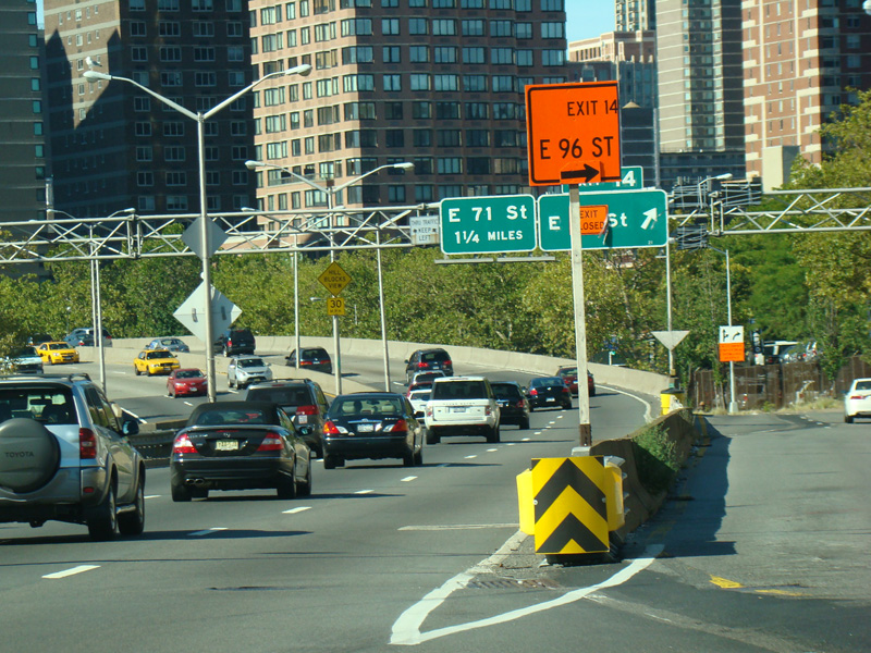 This picture shows the FDR Drive at exit 14 after the completion of the construction work to move back the exit ramp. At the time, an "Exit Closed" sign covered the old sign for exit 14 and a temporary orange sign marked the new exit location. Several months after the picture was taken, the old sign for exit 14 was blanked out altogether and a new temporary orange sign that simply reads "Exit" was installed.