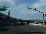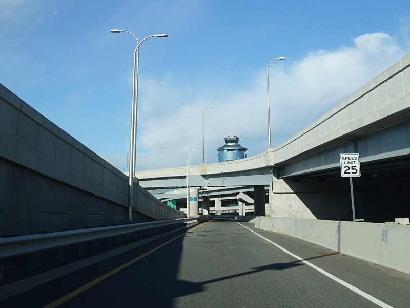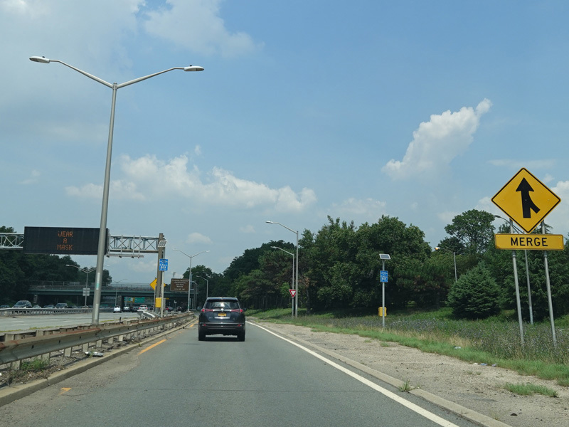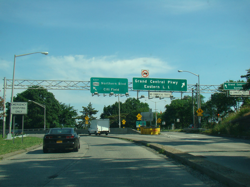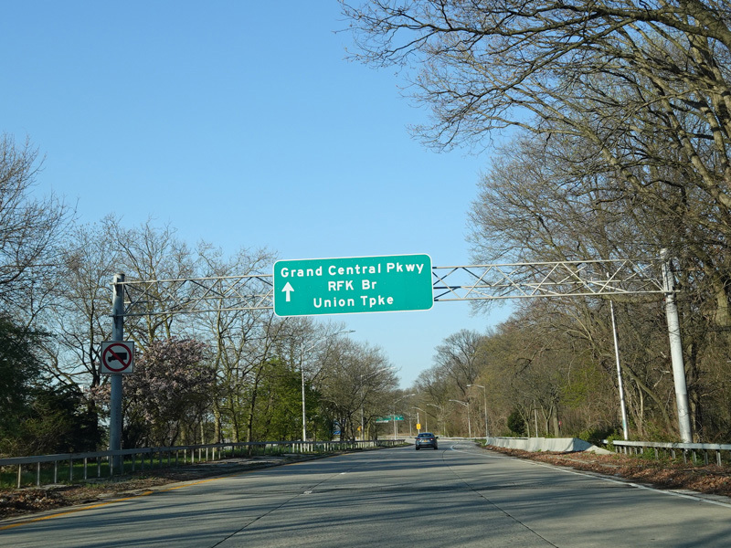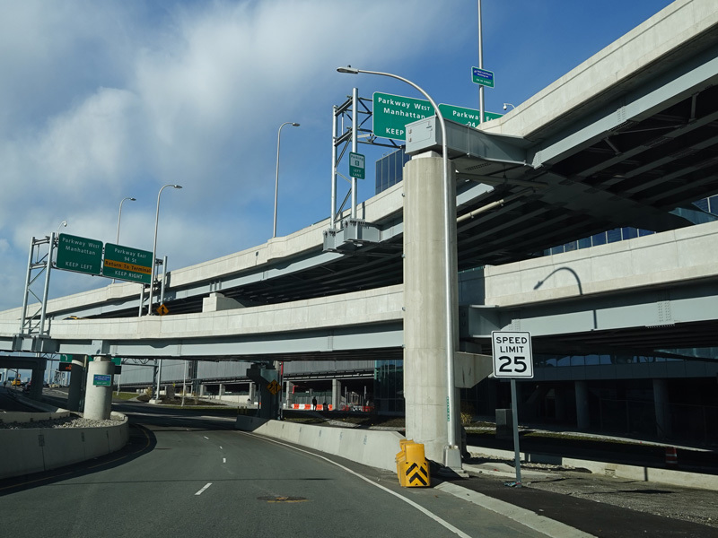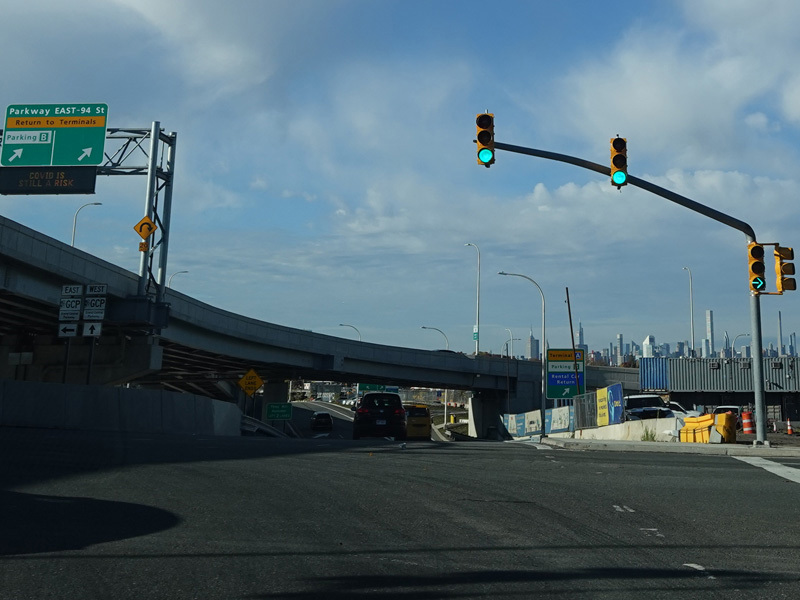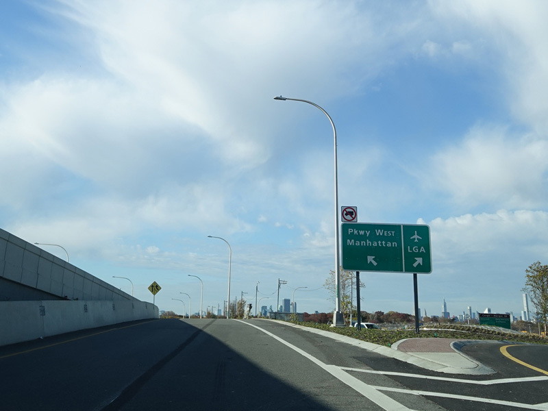 The ramp for exit 7 when travelling west runs next to the parkway for a short distance near La Guardia Airport. There is an exit from the ramp for the airport terminals except for Terminal A. After a short distance, there is a traffic light at 94 Street. Then, the ramp splits. Bear right for Terminal A or left to continue west on the parkway.