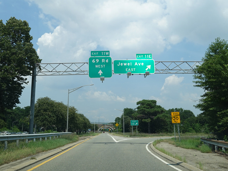Exits 11E-W when travelling west share a common ramp. Use the first exit from the ramp for Jewel Avenue east or the second exit for 69 Road west.