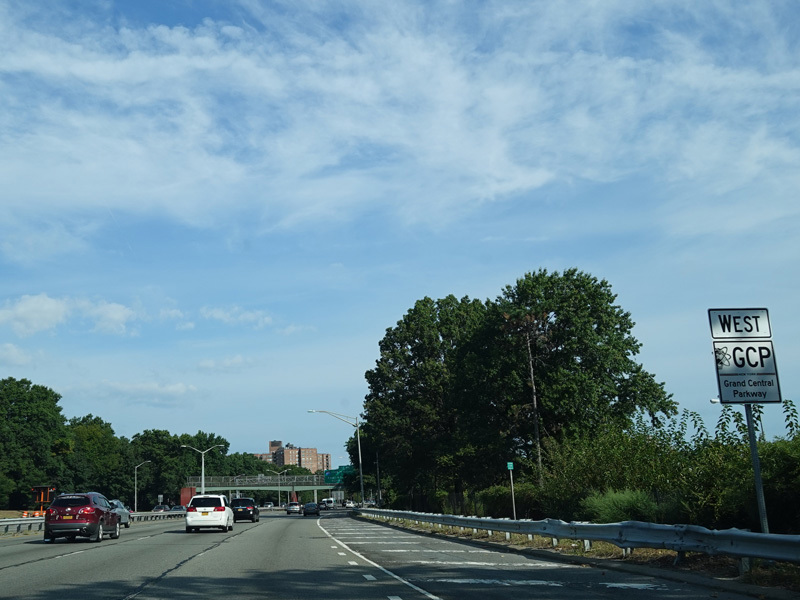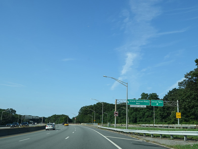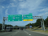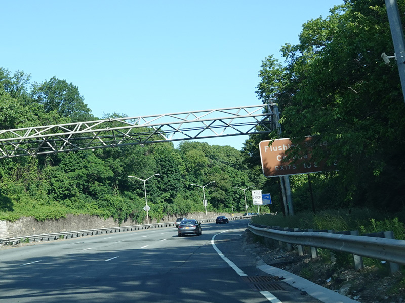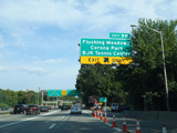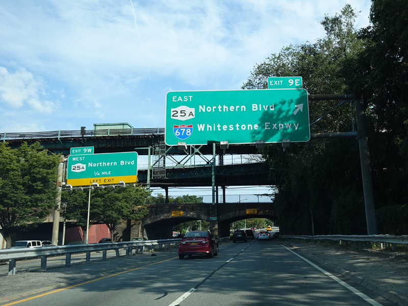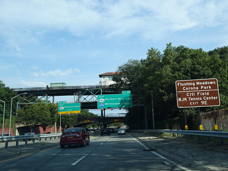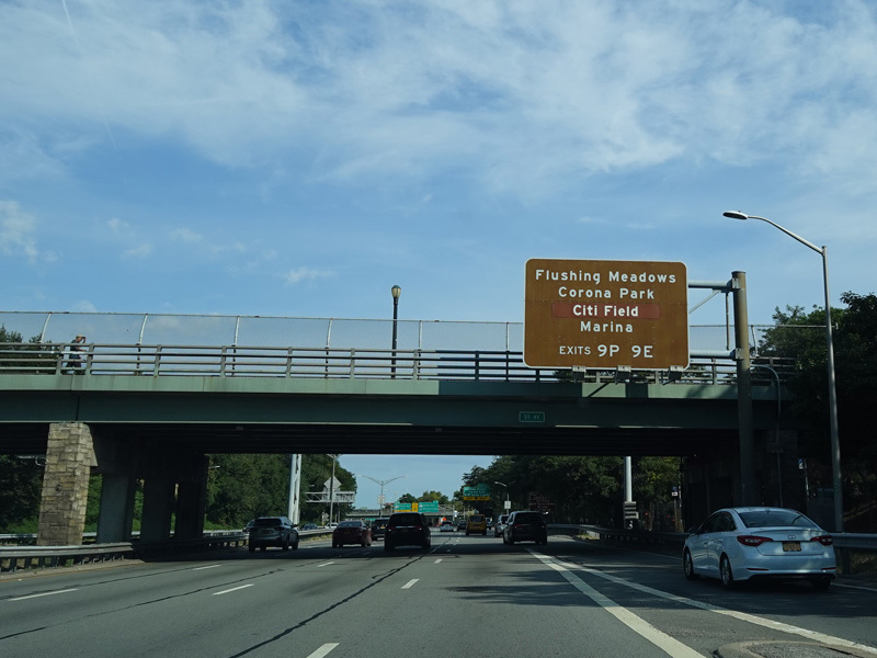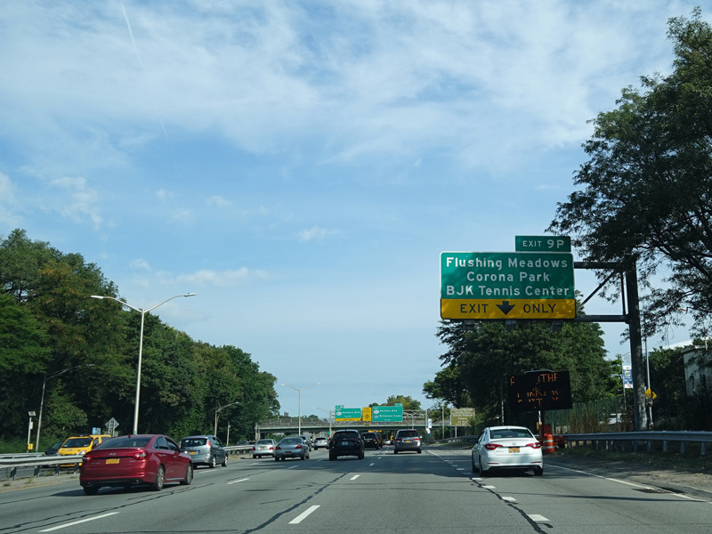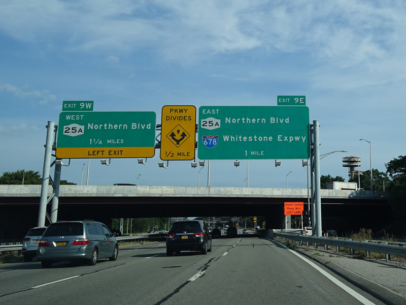 Exit 9P is for Flushing Meadows Corona Park. Exit 9E is for Northern Boulevard (NY 25A) east, the Whitestone Expressway (I-678) north, and the Van Wyck Expressway (I-678) south. Exit 9W is for Northern Boulevard (NY 25A) west.