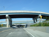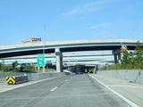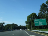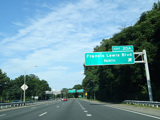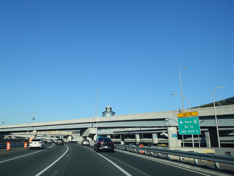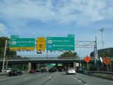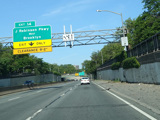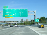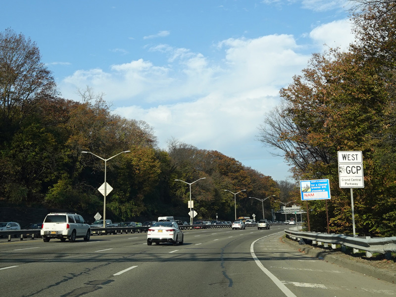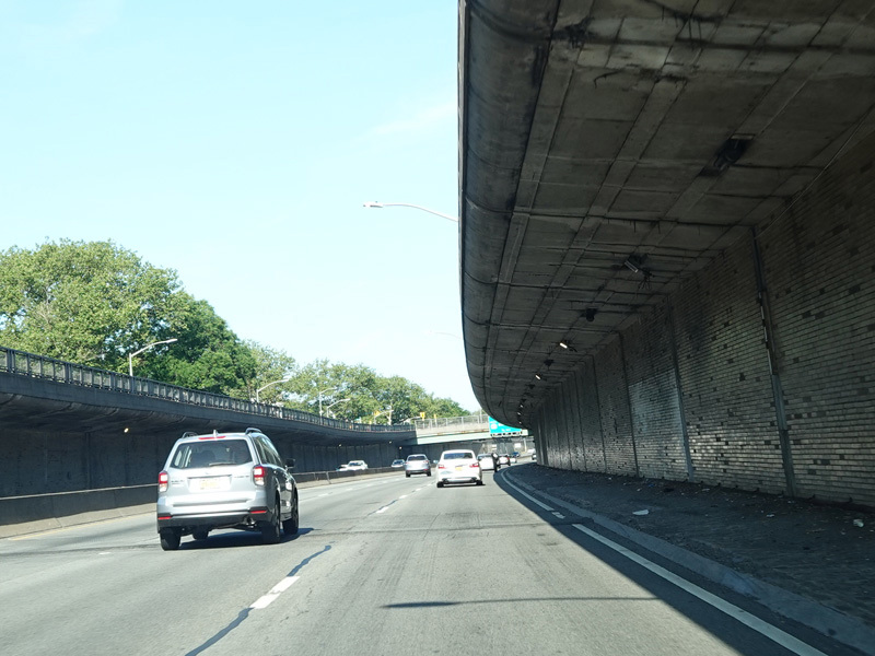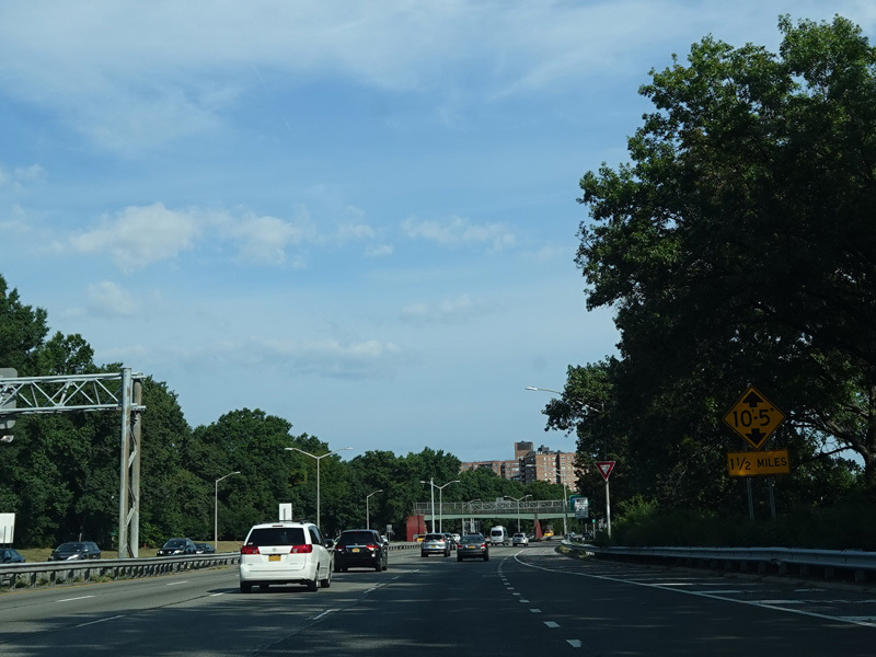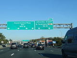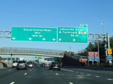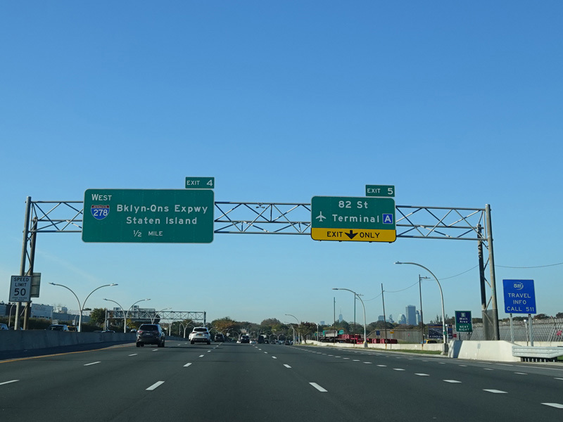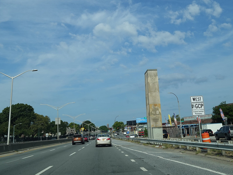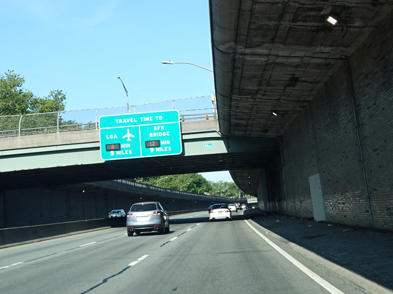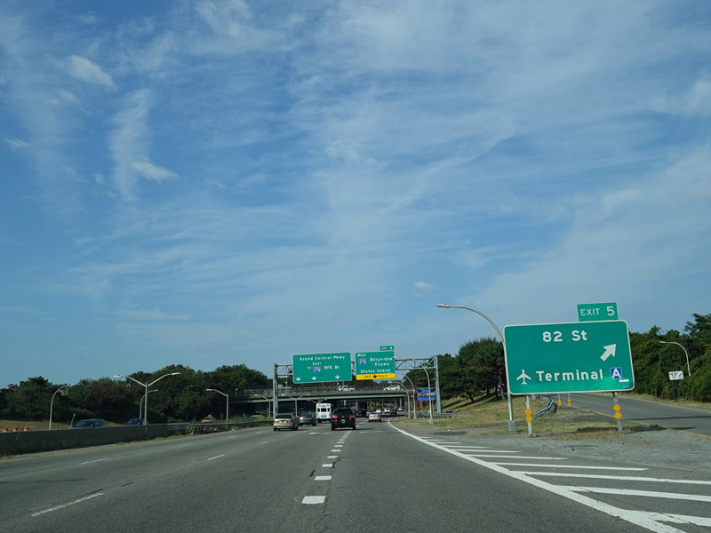 Exit 9P is for Flushing Meadows Corona Park. Exit 9E is for Northern Boulevard (NY 25A) east, the Whitestone Expressway (I-678) north, and the Van Wyck Expressway (I-678) south. Exit 9W is for Northern Boulevard (NY 25A) west.