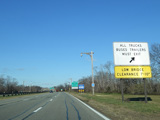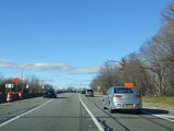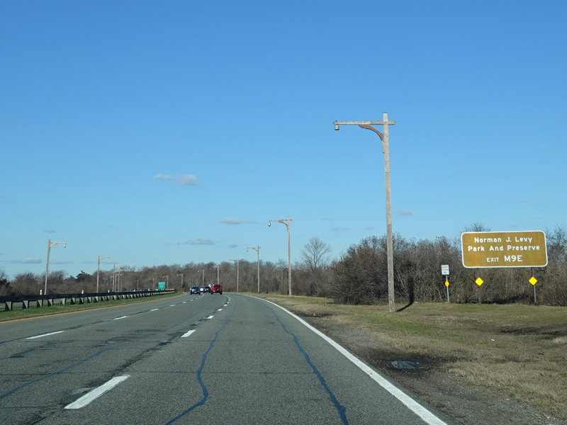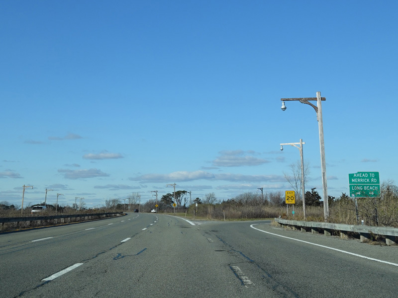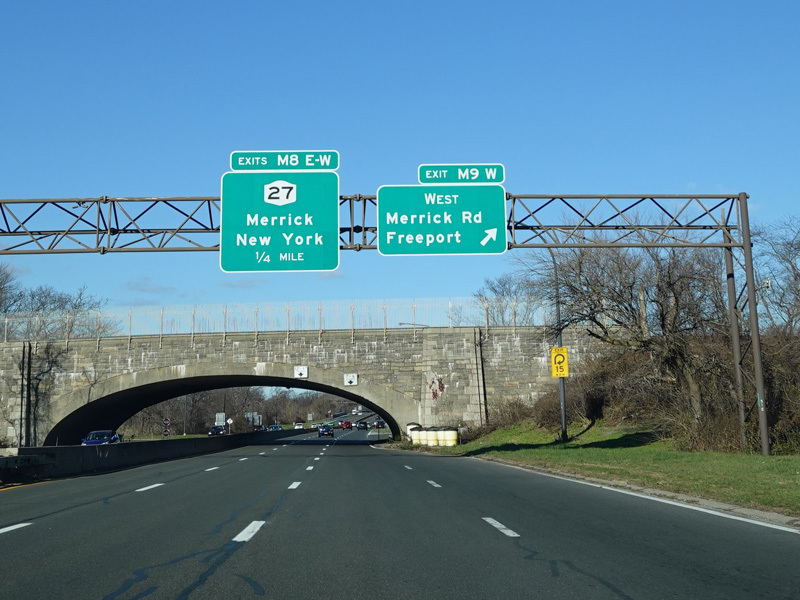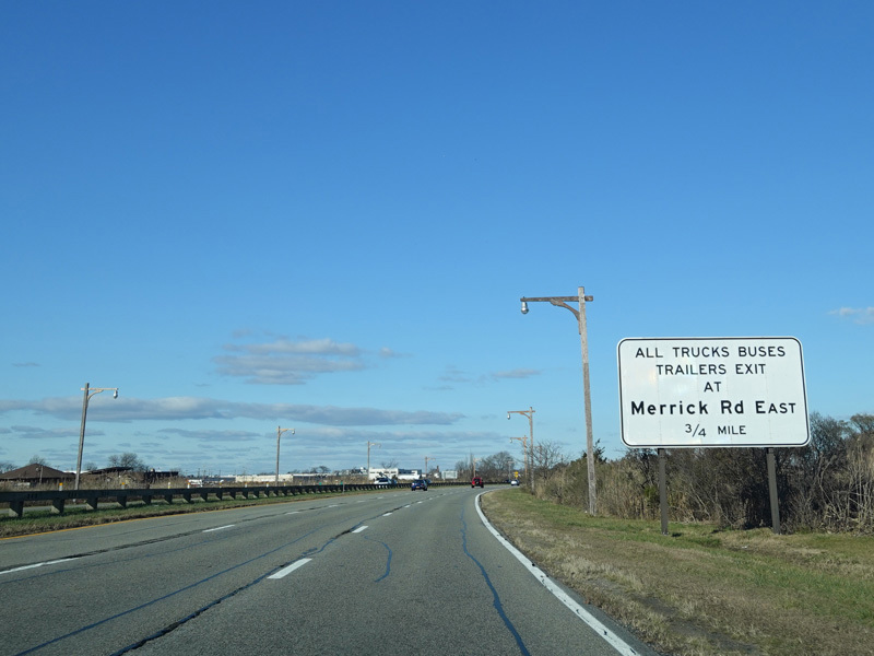 Exits M9E-W are for Merrick Road (CR 27). Trucks, buses, and trailers are allowed on the parkway south of this point so that they can access Jones Beach, but they must exit here.