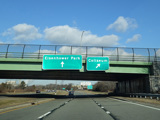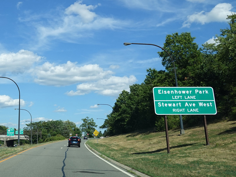 The ramp for exit M3W splits. Use the left lane to go east on Stewart Avenue (CR 177) toward Merrick Avenue (CR 4) and Eisenhower Park. Use the right lane to go west.