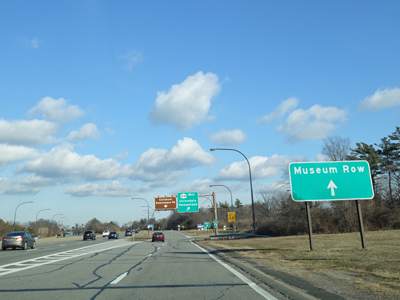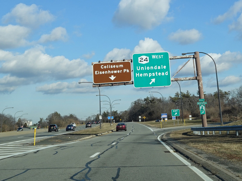 The ramp for exit M4 when travelling north has exits for Hempstead Turnpike (NY 24), the Nassau Coliseum, and Eisenhower Park.